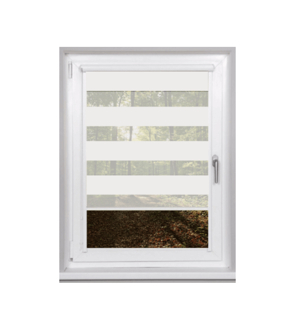 Enrollable adhesivo con cajón y guías de PVC confeccionado a medida, para fijar a hoja de ventana. Fácil instalación sin tornillos. Tejido noche y dia, deja ver a su través dependiendo de la posición de las franjas horizontales.