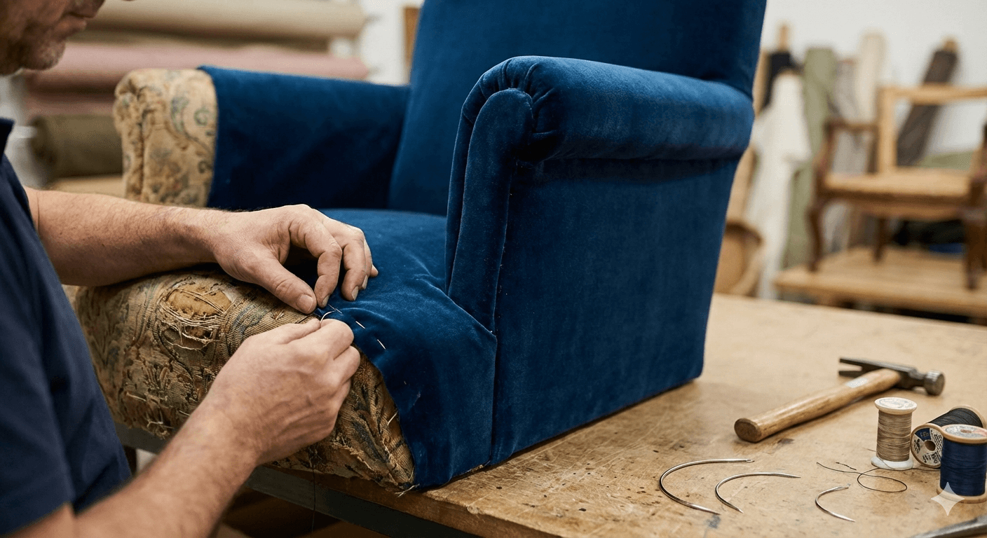 Un artesano trabaja meticulosamente en el retapizado de un sillón clásico, devolviéndole su esplendor original.
